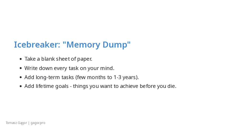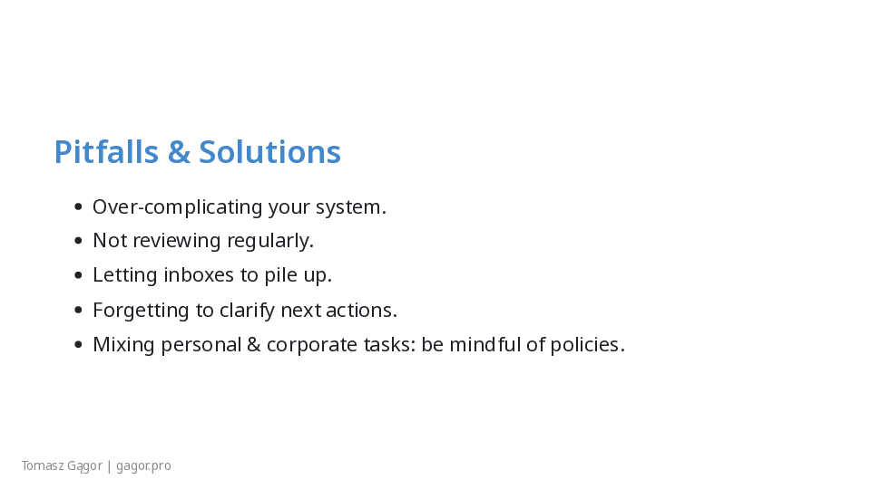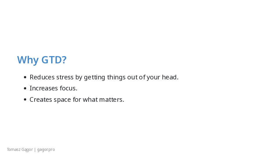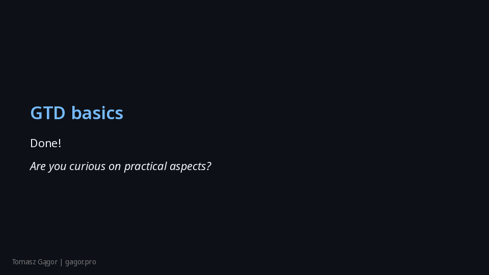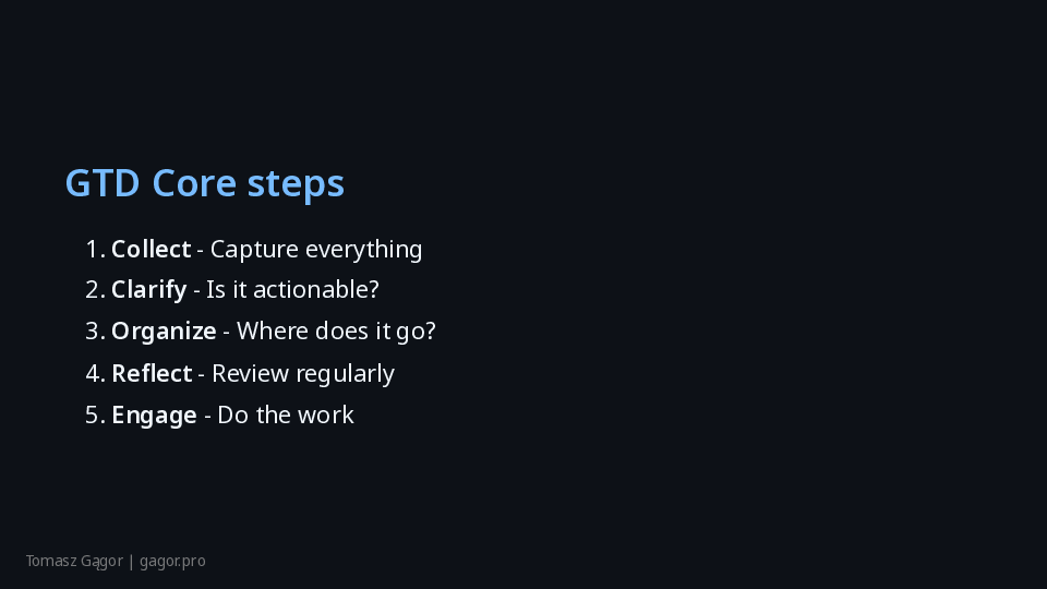 - Brief intro, set expectations: “No theory, just actionable GTD.”