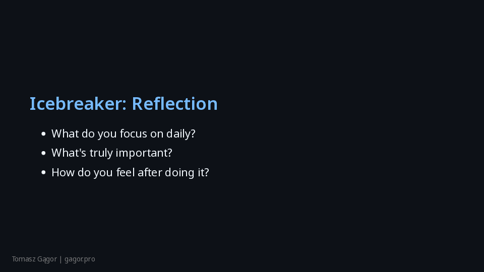 - Group reflection: What do you focus on daily vs. what really matters?