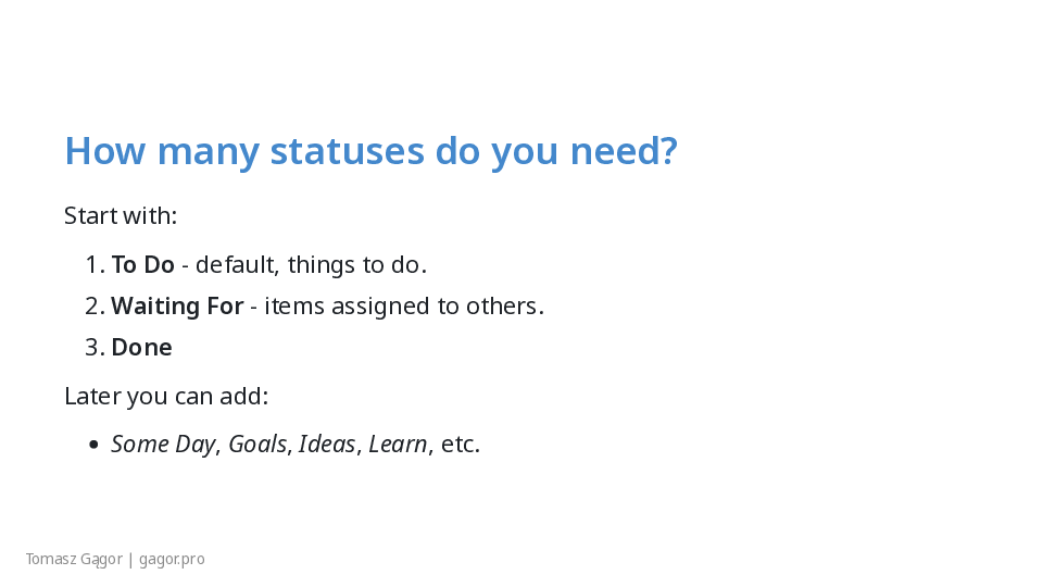 - Someday/Maybe - plans for the future, things that might require collecting more details.