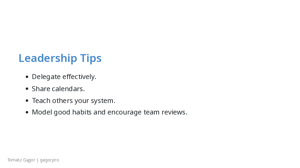 - Leadership tips: delegation, team GTD, shared calendars.